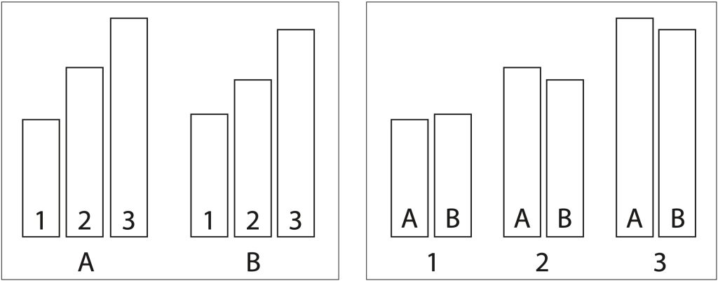 For example, the left and right-hand visuals above show the same data in different layouts. If your message is that there are subtle differences between A and B in the data, then the right-hand visual conveys this message more clearly than the left-hand visual.