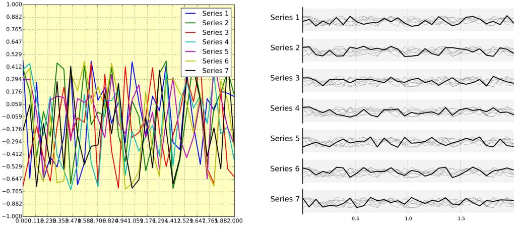Above is an example of “chart junk.” The left-hand image was automatically generated by the plotting software and shows all the curves confusingly overlapped, supposedly for comparison. Further, the legend overlaps the curves, and the labels are crowded. By comparison, the right-hand plot separates each curve for clarity. From the paper by Rougier, Droettboom, and Bourne.