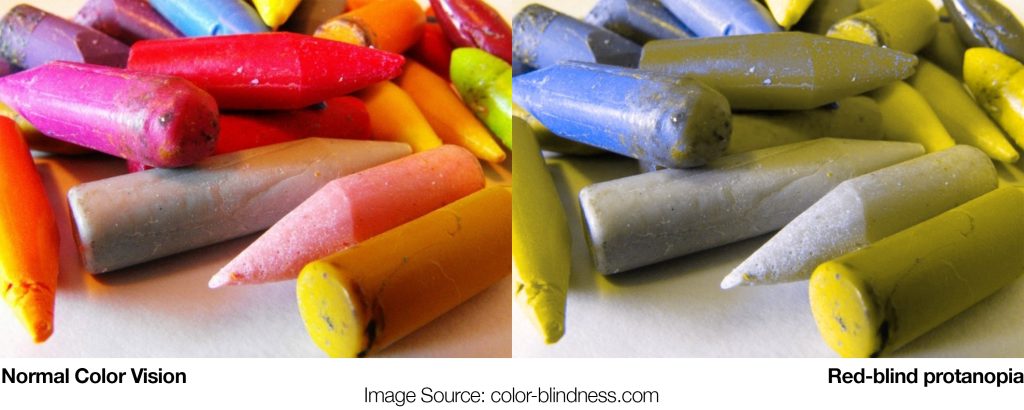 Color blindness affects approximately 1 in 12 men (8%) and 1 in 200 women (0.5%). Red-green color blindness is by far the most common form, which means that red and green look very similar to people with this form of color blindness.