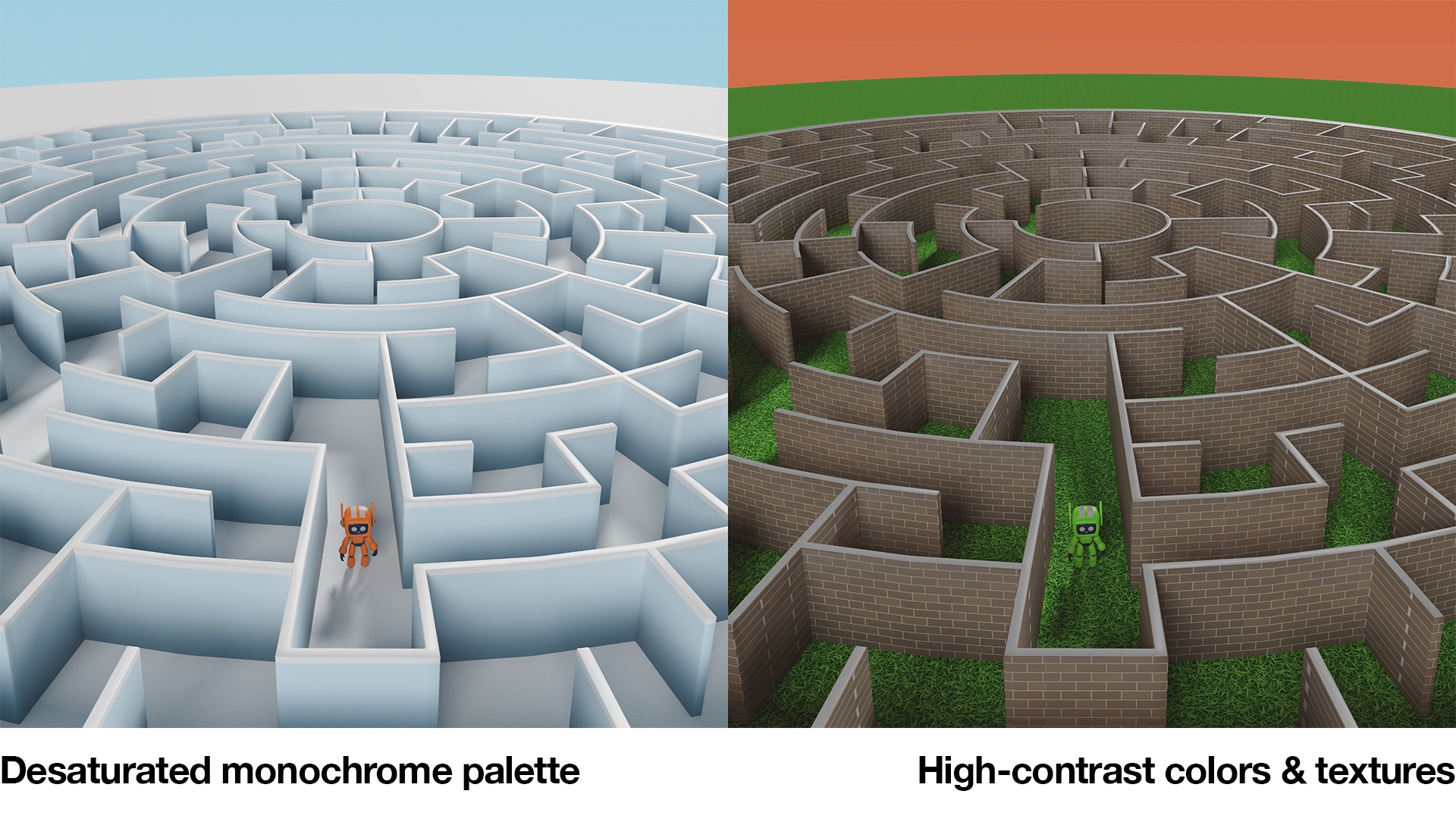 By comparison, the image on the right uses high-contrast colors for the environment, making the bot harder to see. Furthermore, the background color is a very warm shade of orange, which would be better suited for a foreground element. Finally, the textures used are unrelated to the story of how the bot behaves, and they simply add clutter.