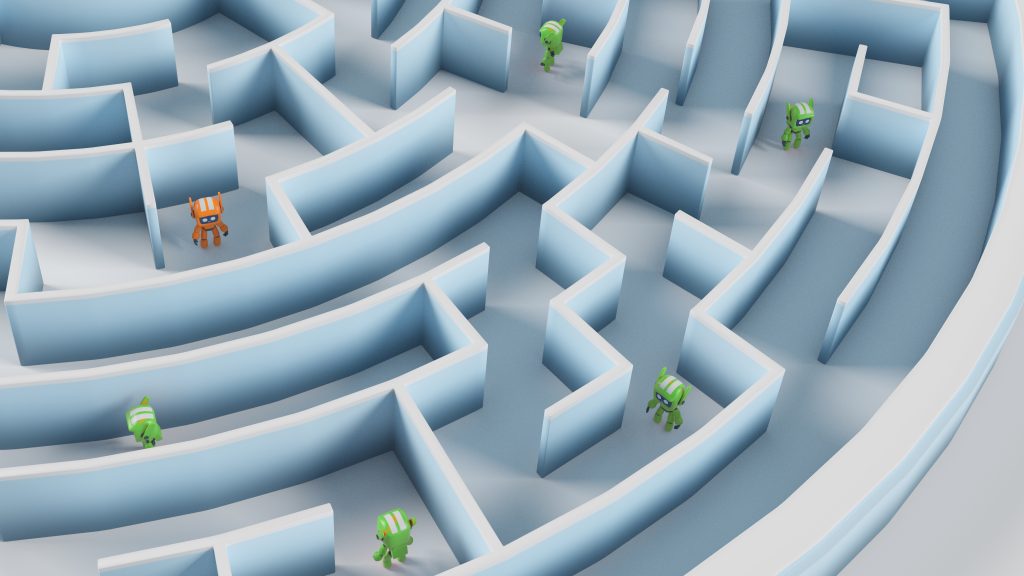 Below is a sample image designed with the same split complementary color palette. Blues were used for the walls, green for most of the robots, white for the ground, and finally, orange for the robot that is the point of interest.