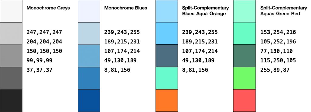 - Complementary colors for the strongest possible contrasts (e.g., blue and orange).